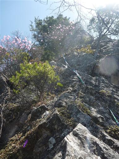 1583m峰前衛峰の岩場。ロープが上から垂れ下がっている。