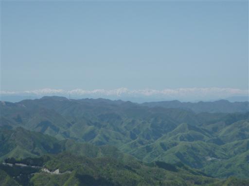 緑色の西上州の山々、その向うに真白な上越国境の山々が見える。