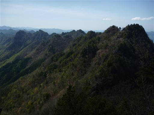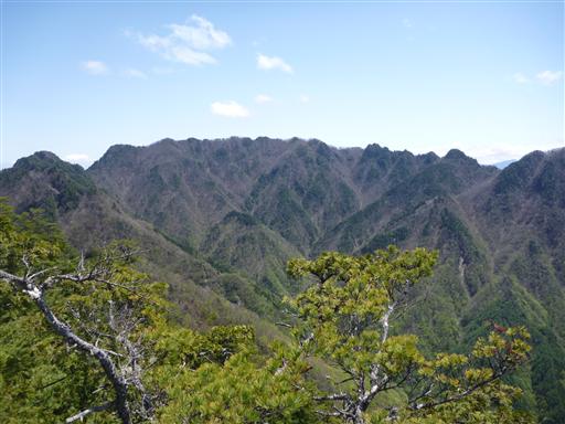 振り返ると今まで歩いてきた赤岩尾根のギザギザの稜線が見渡せる。