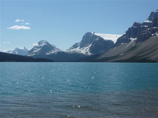 この湖は非常にきれいな青色をしている。背後に見えるのはボウ氷河。