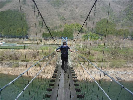 吊橋で河内川を渡る。非常によく揺れる吊橋だ。
