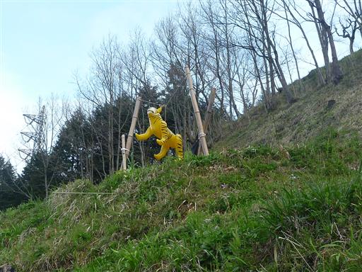 トラの人形が置かれている。カラスよけだろうか?