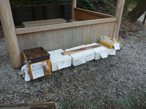 野菜や果物が箱に入っている。無人の野菜売り場のようだ。