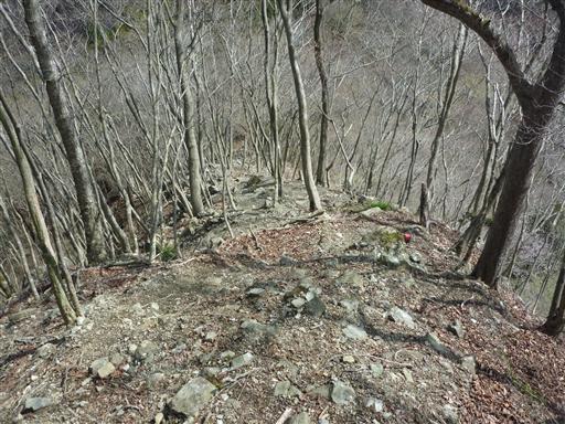 山頂からは急斜面の痩せ尾根を下っていく。