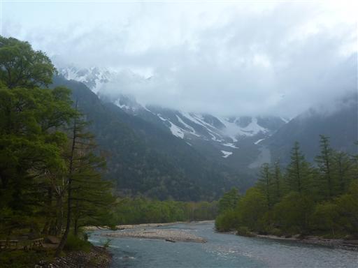 穂高岳にも雲がかかっている。空は比較的明るくどんよりはしていない。
