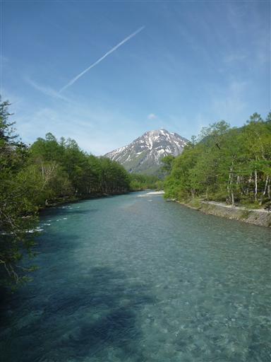 穂高岳の反対側には、美しい梓川の向こうに焼岳の姿が見えている。