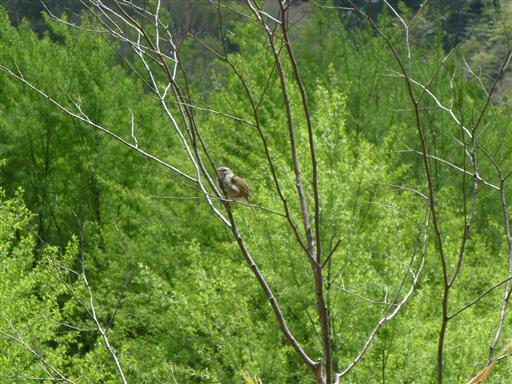 ウグイスが木にとまっている。ウグイスが鳴いているところを初めてこの目で見た。