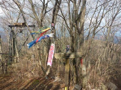 分岐点にある標識には季節外れのこいのぼりがたなびいている。