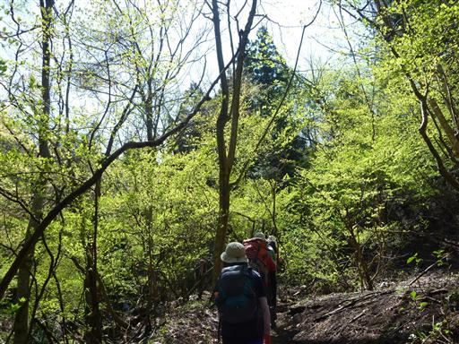 明るい黄緑色の新緑の中を歩いていく。