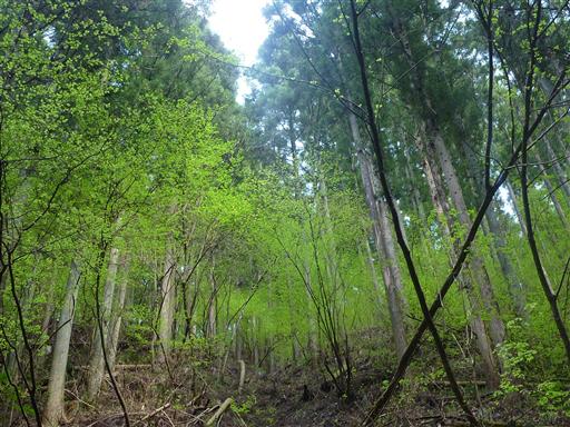 薄暗い植林地帯の中で、新緑が一際眩しい。