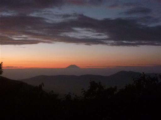 夜明け前、富士山のシルエットが東の方角に浮かぶ。