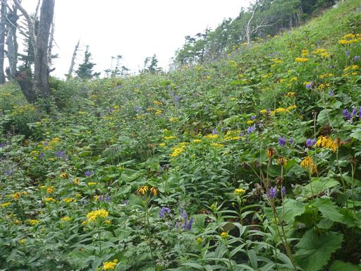 山頂から遥か下方まで下りてくる。少し地味だがこの辺りにはお花畑が広がっている。