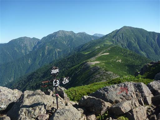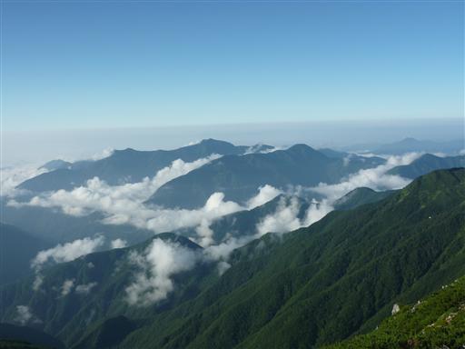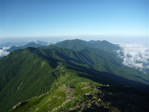 上河内岳以南の南アルプス。緑に覆われた美しい山脈が続いている。