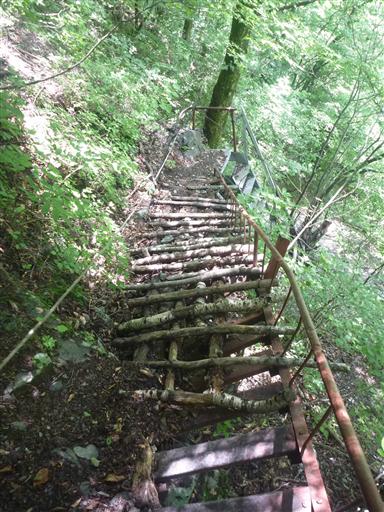 鉄のはしごが壊れているその上に、木でできたはしごが架けられている。