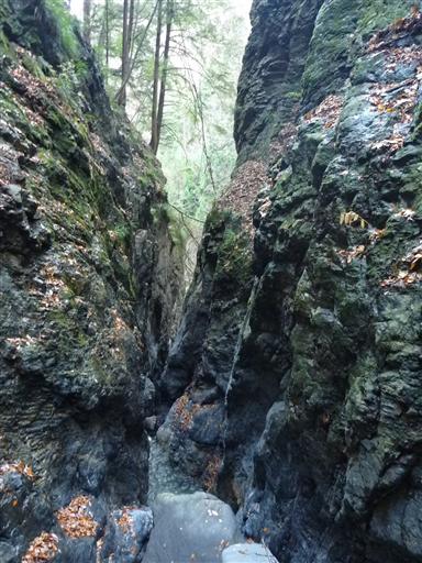 滝壷まで下りると、鋭いV字渓谷を水が流れていく。