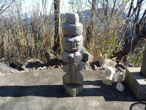 道端に木彫りの不思議な像が置かれている。