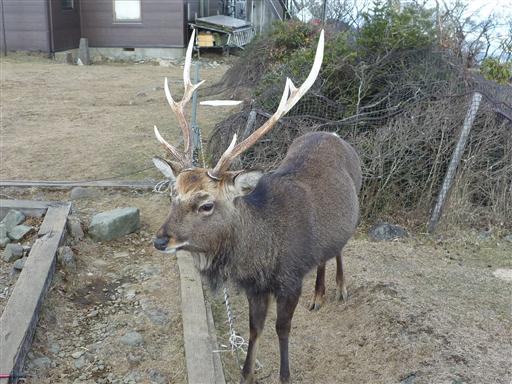 山頂で昼食をとっていると立派な角を持つ鹿が出現。人間に食べ物をねだっている。