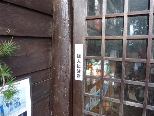尾根の途中にある山小屋の入口に「猛人に注意」と書かれている。
