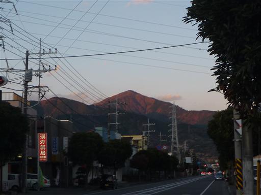 大山が夕日を浴びて真赤に染まっている。